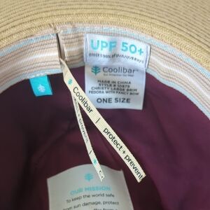 Chic tan sun hat with a stylish purple band. Ideal for sunny days.