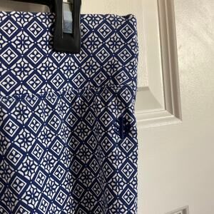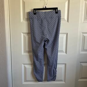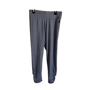 Coolibar UPF 50+ blue printed matiz ruched capris. These have a thick waistband. Minor fading. No flaws or other signs of wear.
