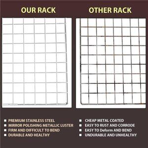 🧿High temperature resistance, suitable for use in the oven or grill. Put the grill rack on a biscuit board as a drip tray, roast fat out of the food, allow you to make a crispy crust on chicken wings, turkey or bread