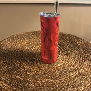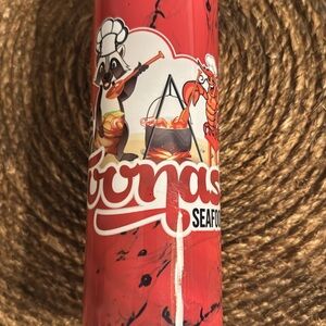 Aluminum skinny cup with Coonass Seafood LLC. Characters are boiling up some crawfish. Perfect for keeping drinks hot or cold. Has a straw or you can close the lid. 20 Oz. NWT