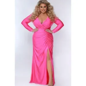 Your wish for a bold and sexy gown with sleeves has come true! This dress packs a fashion punch with its fitted silhouette in stretch lycra with hot fix stones. Details like the deep-v neckline, ruched waistline, and skirt with a slit and sweep train continue to catch the eye. You will have the power of hue in knockout colors like Blue Attitude, Hot Pink, and Screamin'. This dress would be perfect for prom, pageant or any other event!