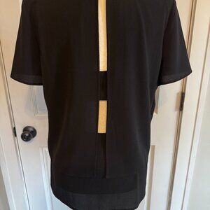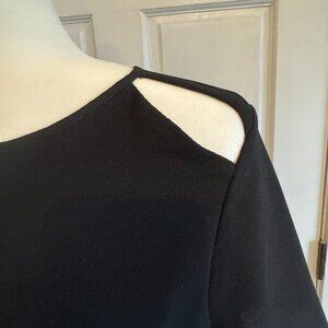 Stylish black top with cutout shoulder design. Short sleeves. Perfect for casual or dressy occasions.