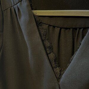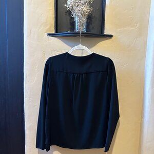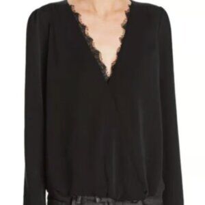 Like new. Black chiffon (100% Polyester). Wrap top with lace. Long sleeves. V-neckline. Partially lined. 23" from shoulder to hemline. Imported.