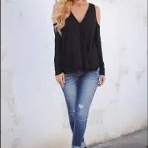 Cooper & Ella NWOT has deep V neckline framed by bare shoulders in a long sleeve cold shoulder blouse finished with a slim, sheer panel across the back shoulders and a shirttail hem peeking out from beneath the top layer.