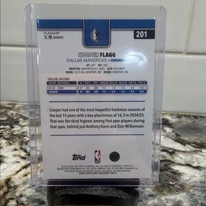 Topps card featuring Cooper Flagg RC in a blue and white Mavericks uniform. Ideal for basketball fans and card collectors.