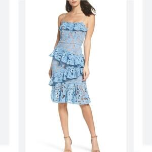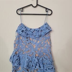 Cooper St Lace Parfait Ruffle Dress. Beautiful pale blue with neutral tone under slip. Lightly shaped tube top style and spaghetti straps, Lace ruffle layered in alternating diagonal pattern.