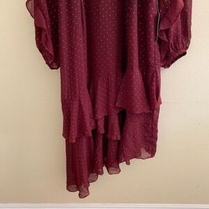Cooper St Chiffon Dress Texture Dot & Ruffle Red White Asymmetrical Hemline