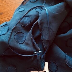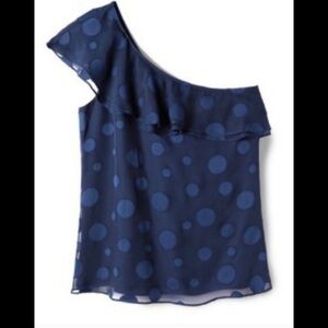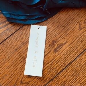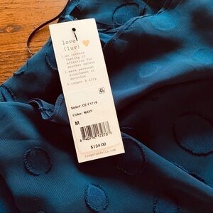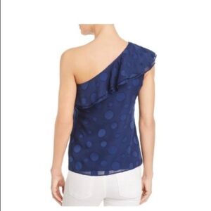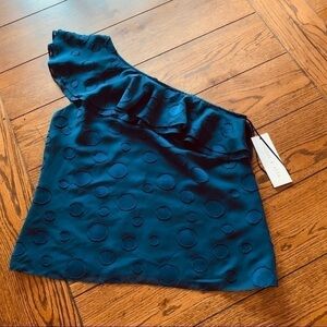 Cooper and Ella Off the Shoulder Blue Blouse with circular pattern.