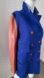 A designer sample double-breasted coat featuring a striking blue body and contrasting brown leather sleeves. There is a tiny hole in the right pocket, as shown in the fifth picture.