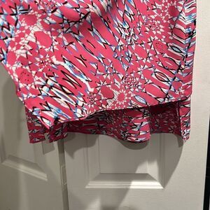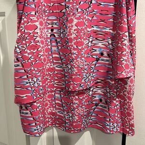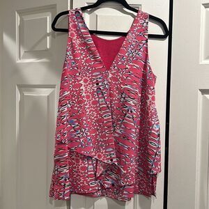 Cooper & Ella Pink Layered Blouse, Size Large. Flowy Too with an overlay layer. Colors are hot pink, blue, black and white. One of my favorites but gained weight so it’s too small now :( great condition