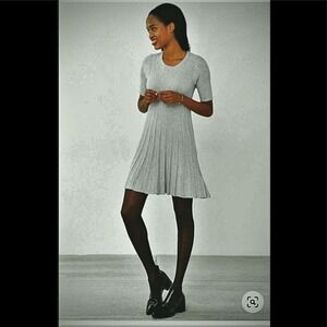 Stylish gray mini dress. Features ribbed texture. Short sleeves and pleated skirt. Perfect for casual outings.