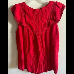 EUC- Cooperative red ruffle sleeved blouse with pintuck front and buttons, the back has pintuck detailing as well. Navy trim runs all around the edges/hem of blouse. Perfect blouse for a casual day, 4th of July when paired with white shorts or jeans, or for summer casual fridays at the office.
