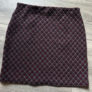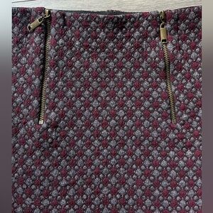 Maroon and gray geometric body con skirt from Urban Outfitters. It has two working zippers on the front. it has a stretchy, elastic wait and the skirt material is also stretchy/form fitting.