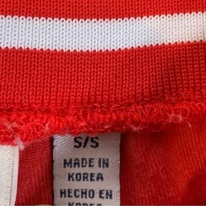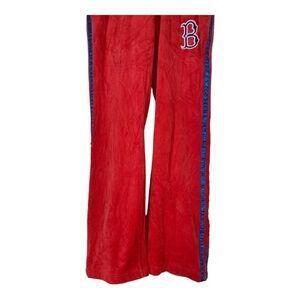 Features: Velour red pull on Boston Red Sox Baseball team track pants. Racing stripes on each leg. Contrasting elastic waist band. Embroidered "B" on the front . Pull on.