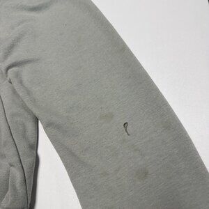 Visible wear. Pilling. Stained. Burn hole in sleeve.