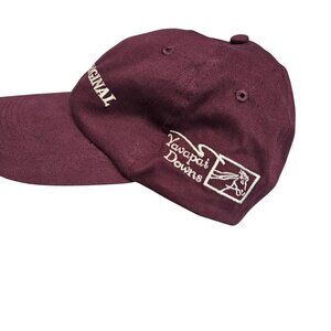 This maroon baseball cap, embroidered with Coors Original and Yavapai Downs logos, offers a stylish and comfortable fit. The adjustable strapback ensures a customized size, making it suitable for various head sizes.