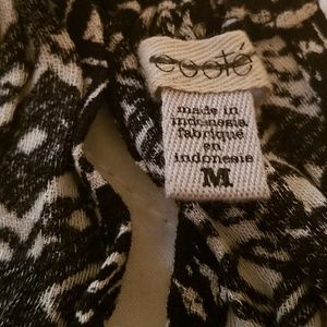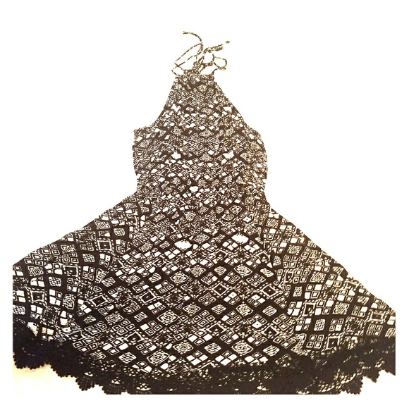 Good condition. Black and white. Black crocheted lace around bottom. String tie top.