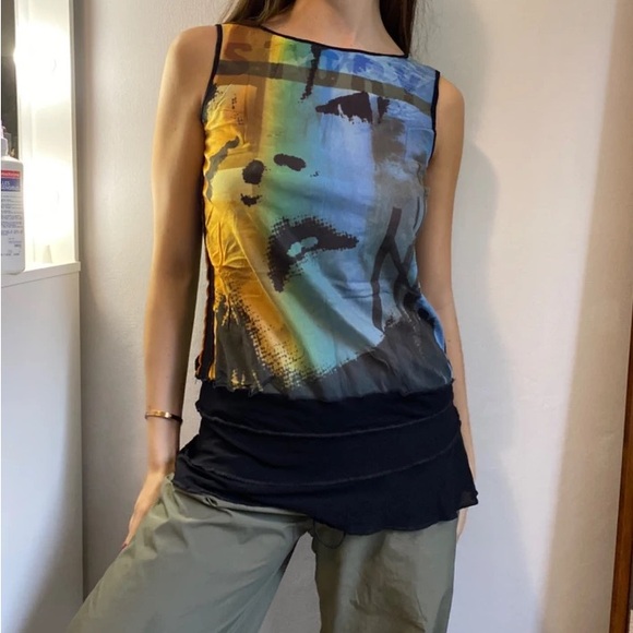 super sick vintage Cop Copine sleeveless tunic with black ruffles, blue green yellow and orange ombré with face design I’m 5’9