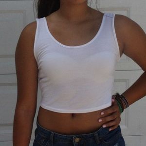 White tank top. Can fit as a crop top or small tank. Great to fit those high rise bottoms, easy to dress up, or cute for a simple casual look. Any size