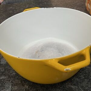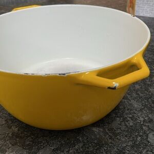This is a great vintage set of Copco 6L Yellow and 2L Brown Cast Iron Pots with Lids. The larger yellow pot shows scratches and chips, but still excellent cooking quality. 14” x 5.5”. The brown pot does not show any chips, but some scuffs. 10.5” x 4”