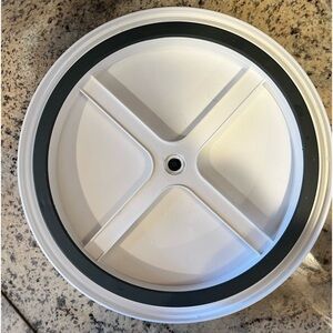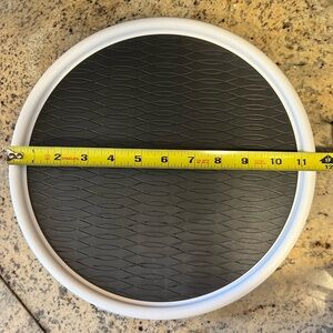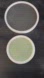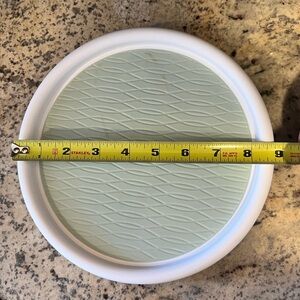 Large 12” is gray and white, small 9” is mint green and white. Small as a stain but it’s clean. Both work as they should. Stain is visible in pix above on sm. mint green.