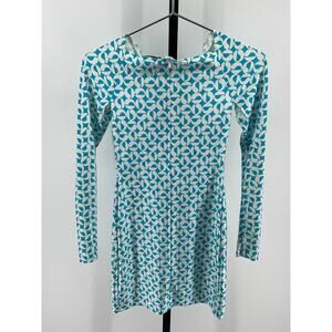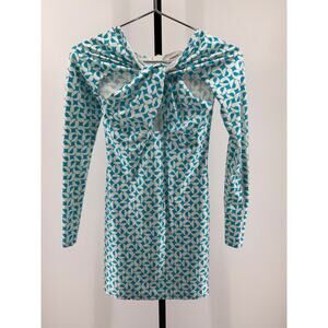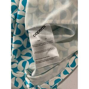 Coperni 'Twisted' Blue Polyamide Cut Out Mini Dress Size XS: unlined, pull-on styling, front cut-out design, thick spandex fabric, measurements: 14 inch bust x 31 inch length, two tiny discolorations on the front right sleeve, discoloration on back left shoulder and back left arm, staining is more visible on the interior but faint on the outer, light pilling on elbow area of both sleeves and on the back hip area.