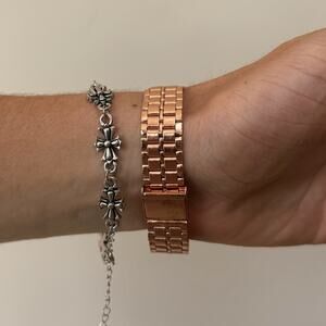 retro-style digital display with rectangular case & rose gold stainless steel band