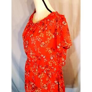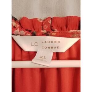 Lauren Conrad Red Floral Summer Dress. Flowy and Boho Style, with an elastic waist and a tie at the front of the neck. Size XL. 21" pit-to-pit, 17" across the waist, and 31" long.