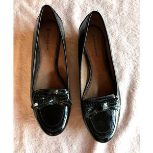 These flats with zig-zag edged bows are in very good condition. There is some very light wear and creasing but they still look almost new. Great for any occasion, or the office. Be comfortable while looking good!