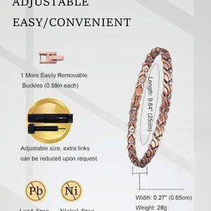 Features: Stylish, finely polished pure copper anklet with an adjustable length. It has a strong clasp that stays secure, plus magnetic features for added health benefits. Suitable for dressing up or casual wear, and can also be worn as a bracelet.