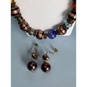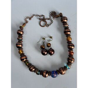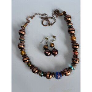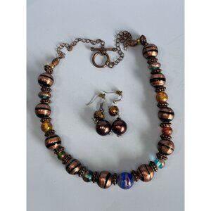 Copper Blue Green Orange Venetian Glass Beaded Necklace & Earrings Set