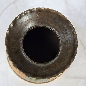 This charming little vase is made of copper with a brass accent and has a silver cat on the front. The top of the vase has a hammered texture and a scalloped top edge. Perfect for a cat lover.