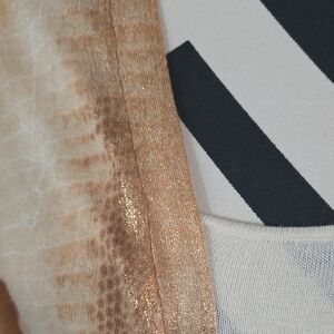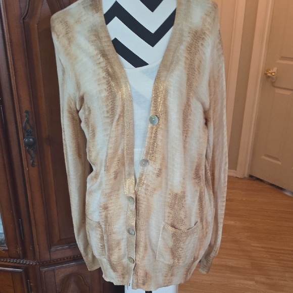 Stylish copper and cream cardigan with button-up front. Features a subtle pattern and pockets. Snake like print.