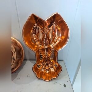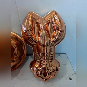 Discover this charming set of vintage copper cake and jello molds, a full set of 3, perfect for adding a touch of farmhouse elegance to your country decor. The collection includes a round Turks head mold measuring 7.5 inches across, another round Bundt mold at 9 inches across, and a delightful lobster mold that spans 9.5 inches in length and 7 inches at its widest point. These pieces are in good vintage condition, showcasing only minor scratches that add to their character.