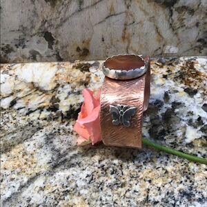 Textured copper cuff is hand wrought. An adorable pair of sterling silver butterflies flank a River Agate set in scalloped sterling. The cuff measures approximately 1” wide, and fits 7.5” wrist or less. If you send your wrist size I can custom fit it for you before shipping. New from my Florida studio. Made in the USA.