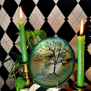 A stunning, one-of-a-kind copper enamel art plate bursting with vivid, layered color and mid-century flair. Each plate in this curated collection is uniquely hand-fired, resulting in mesmerizing tones and abstract, painterly effects that make every piece feel like its own miniature artwork.