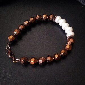 A powerful color choice - a deep rich copper colored glass beads - coupled with creamy smoothness of pearls [faux rondelle pearls], separated by copper spacers.
