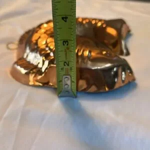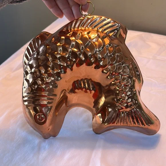 Enhance your kitchen decor with this stunning copper fish-shaped mold. Perfect for baking or as a decorative piece. Its shiny copper finish adds a touch of elegance to any setting.