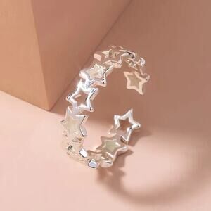 Shine bright day or night with this magical glow-in-the-dark star ring! Crafted with a silver-tone finish, this adjustable open band features a continuous row of star cutouts filled with luminous material that charges in the light and glows in the dark. With a 1.7 cm (0.67 inch) diameter and a flexible fit, this celestial accessory is perfect for any finger size. Whether you're a stargazer, a fan of dainty aesthetic jewelry, or looking for a unique gift, this ring adds a dreamy sparkle to any look.