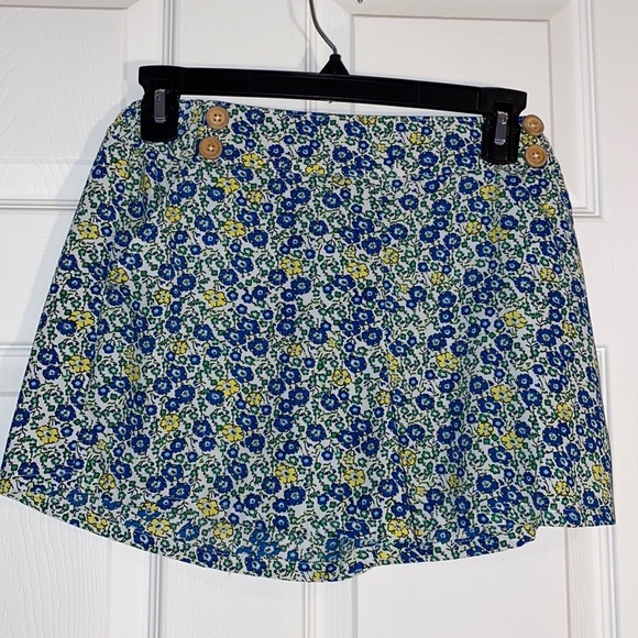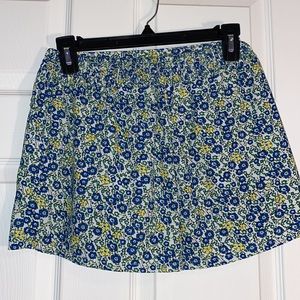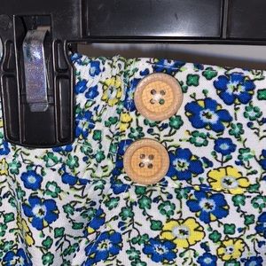 Loose pull on shorts. Light weight material. Front button details. Blue and yellow floral pattern.