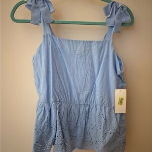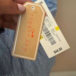 This charming blue tank top by Copper Key features a smocked waistline and ruffled details, offering a sweet and feminine look. The tank top is designed with a peplum-style silhouette and delicate fabric, making it a stylish addition to any wardrobe.