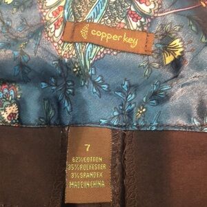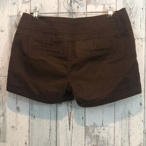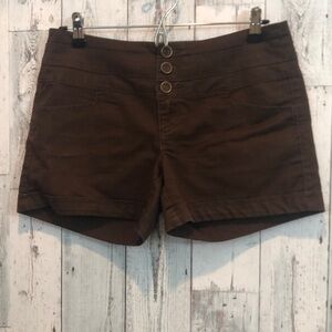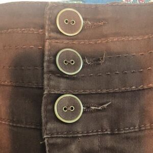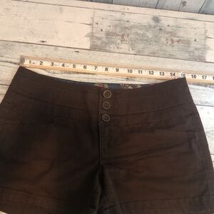 Brown, 3 buttons and zipper closure, 2 pockets, faux back pockets, cuffed, stitching detail on pockets and waistband,colors may vary due to lighting,good used condition, Sz: 7