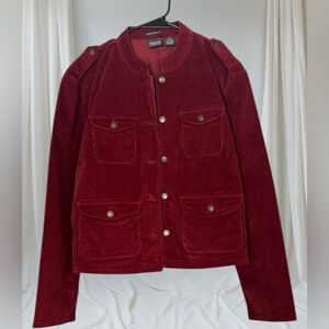 Luxurious deep red velvet jacket with buttoned pockets. Stylish and versatile for any occasion.