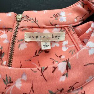 Copper Key fit & flare dress. Bare shoulders. Size small. Excellent preowned condition. No flaws. Rounded neckline and fitted at waist. Approx. measurements: pit to pit 16.5, shoulder to bottom 29". Zipper 20" on back. Polyester 97%, spandex 3%. Peach floral.