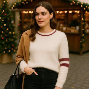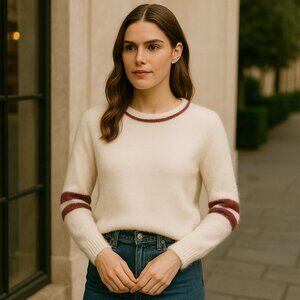 Soft, feather-light & perfectly cozy, this fuzzy eyelash knit sweater by Copper Key blends vintage-inspired varsity details with a modern “Soft Girl Winter” vibe. The ivory base features rich burgundy double stripes on the sleeves & neckline — a nod to timeless collegiate style with a feminine twist.