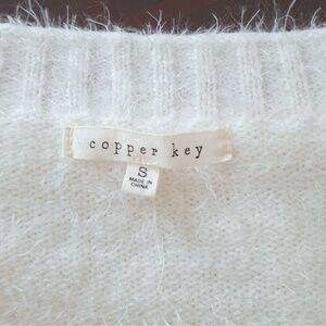 Copper Key sweater, white fuzzy sweater, soft knit pullover, eyelash knit sweater, cozy winter top, fluffy texture sweater, crew neck pullover, minimalist style, soft girl aesthetic, cozy chic outfit, winter capsule wardrobe, feminine knitwear, snow white sweater, cold weather essential, cottagecore vibe, classic soft knit
