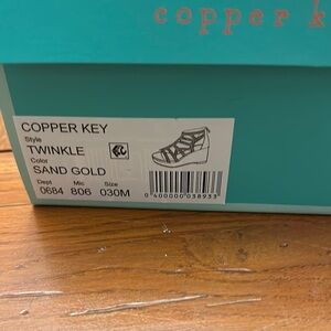 These stunning dress shoes by Copper Key feature a beautiful gold color with strappy sandals design. They have a medium-height heel and are adorned with sparkling rhinestones along the straps, adding a glamorous touch.