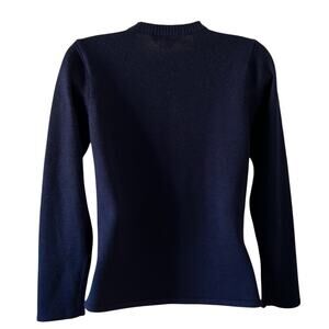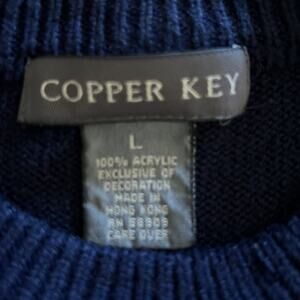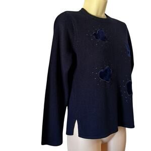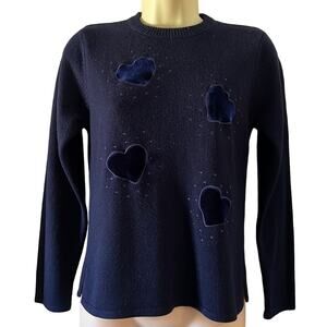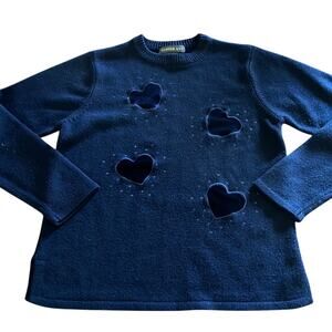 Very good condition Copper Key juniors size large (runs small) Navy blue pullover sweater with velvet appliqué hearts, crew neck and long sleeves