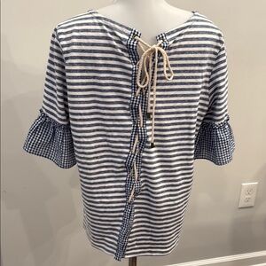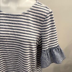 Elevate your wardrobe with this chic striped top. Featuring a stylish blue and white pattern, it's perfect for any occasion. The ruffled sleeves add a touch of elegance.