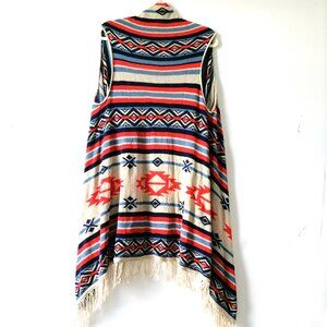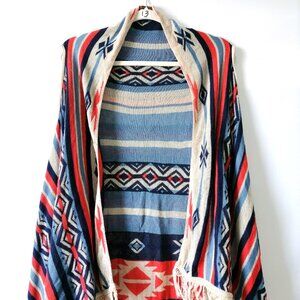 Stylish cardigan with vibrant patterns. Features fringe detailing. Perfect for layering.